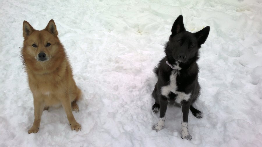 Vasemmalla Litti – melkein puhdas pystykorva (s.2009), ystävällinen ja avoin koira, innokas ja tarvittaessa myös pystykorvamaiseen tapaan äänekäs. Nauttii jälkityöskentelystä, tottiskin sujuu mainiosti.